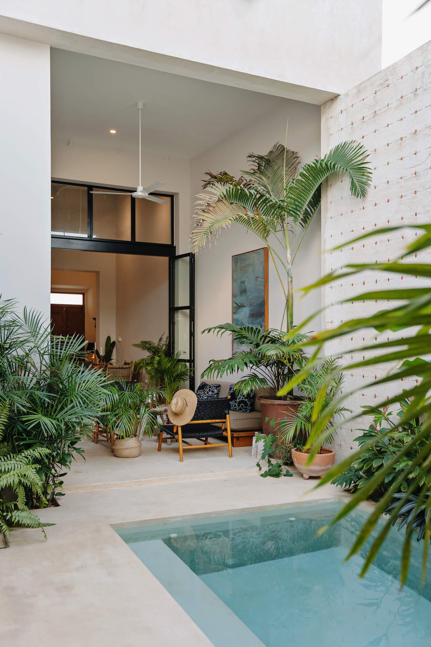 No centro da casa está o pátio, verdadeiro coração do projeto. Ali, uma piscina revestida em chukum se encaixa entre duas paredes altas de concreto com textura, criando um belo contraste com o verde intenso da vegetação. Na varanda coberta, o estar ao ar livre ganha charme com peças artesanais e mobiliário carregado de história. Dois antigos bancos de madeira, originalmente usados para amassar tortilhas, foram transformados em mesas centrais, criando uma ligação afetiva entre passado e presente.