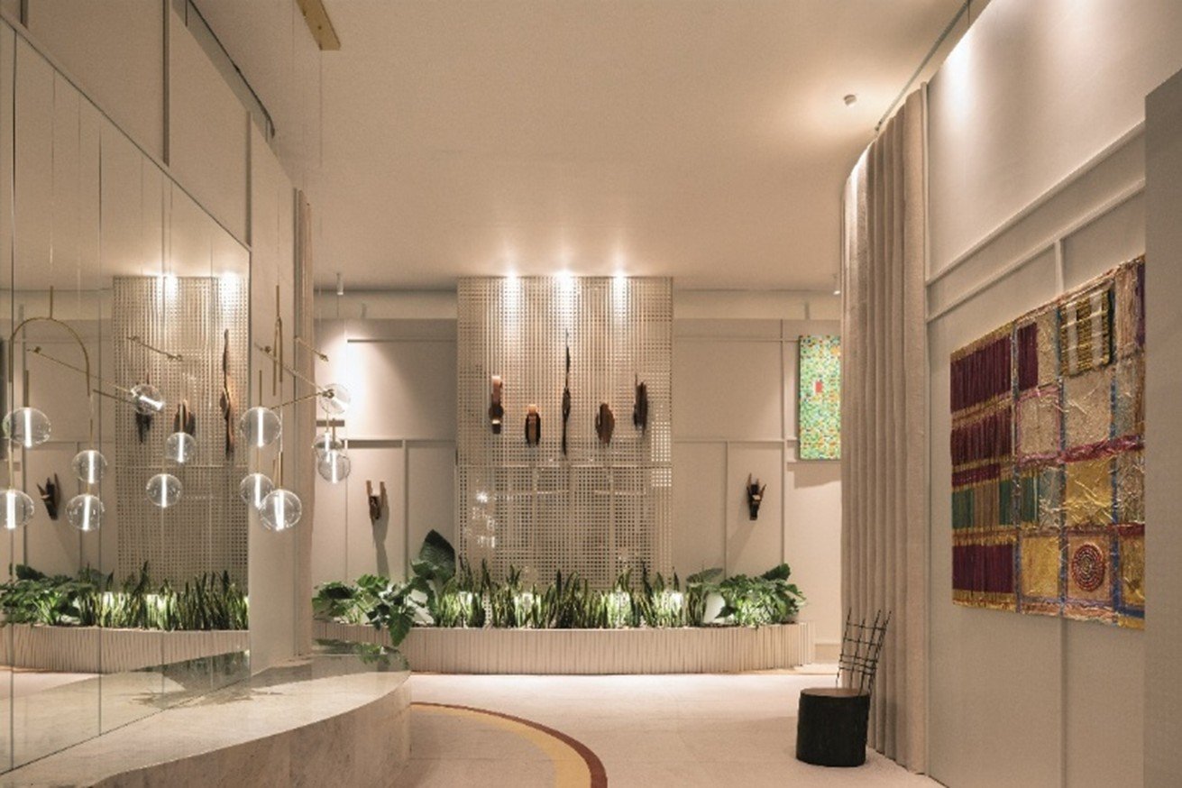Arte, memória afetiva, brasilidade, biofilia e iluminação intimista são alguns dos elementos que se destacaram em mais uma edição histórica da mostra A bilheteria ‘Meu Verde, Meu Sertão’, projeto assinado pela arquiteta sergipana Gleuse Ferreira, foi a grande vencedora do prêmio Veja São Paulo na categoria “Ilha de bem-estar e lounge”. FOTO: MCA Estúdio Localizada