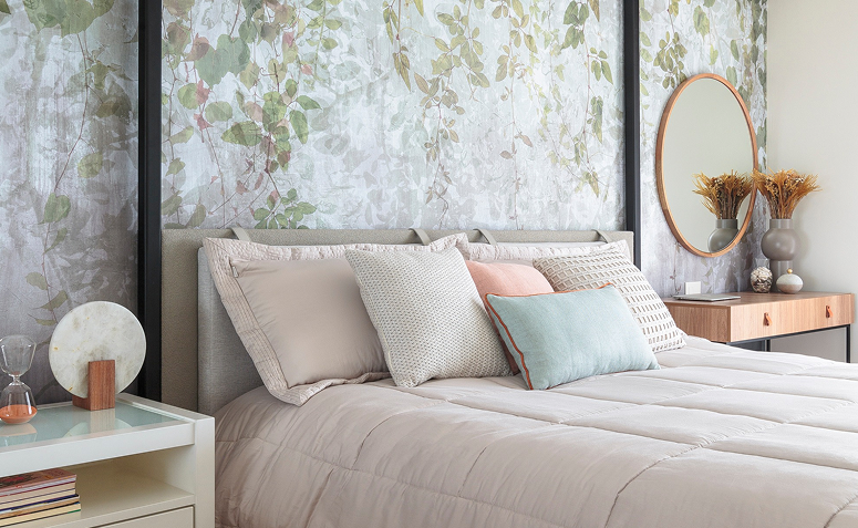 O papel de parede é uma solução rápida e prática que muda o ambiente em poucas horas. Pode ser neutro, com textura suave, ou cheio de estampa. Listras, folhagens, formas orgânicas, vale escolher o que fizer sentido com o estilo do quarto e com o seu também. Além de destacar a parede atrás da cama, ele cria uma sensação de profundidade, sem pesar o ambiente. Os modelos autocolantes facilitam ainda mais a tarefa: você mesmo pode aplicar, sem sujeira, e remover depois, se enjoar ou precisar deixar o apê alugado. É uma ótima alternativa para quem quer renovar o visual rapidamente.